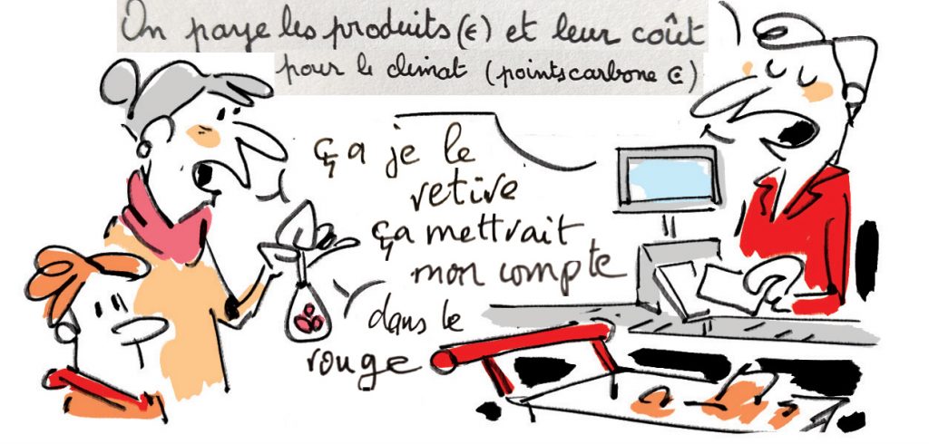 Chaque citoyen reçoit un budget carbone et les entreprises doivent étiqueter les contenus carbone, ce qui les stimule à décarboner comme montré dans le film en magasin :
