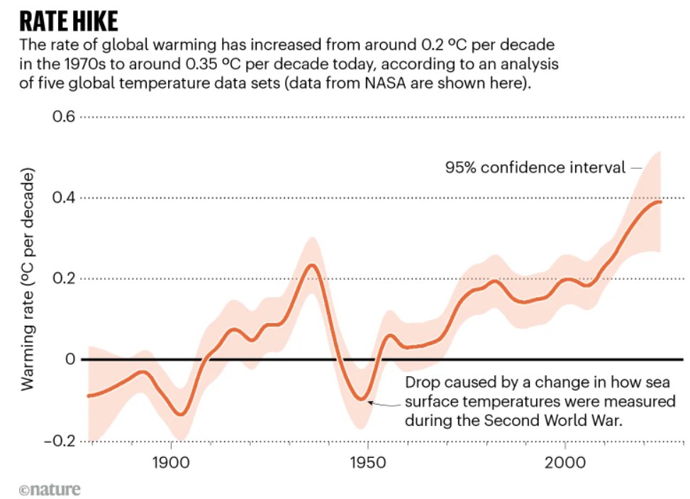 Nous sommes passé d’une augmentation de 0,2 °C par décennie jusqu’en 2010 à un accroissement de 0,35°C par décennie sur 2015-2024 (soit plus 75%).